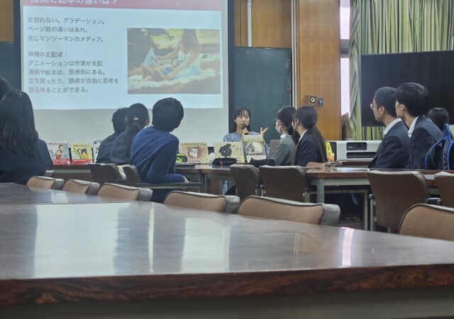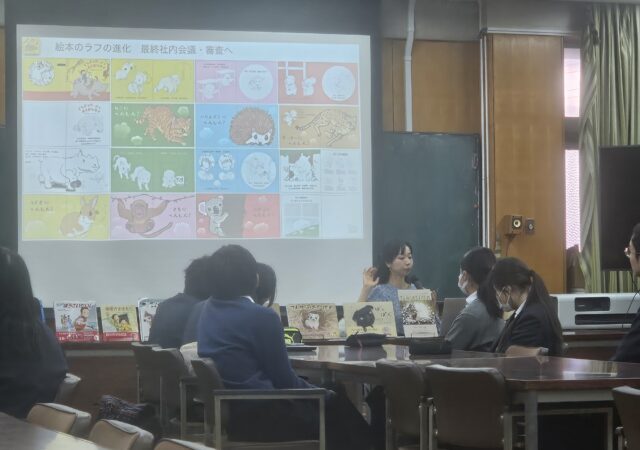 12月12日(金)の放課後、会議室に絵本作家の(かなざわ まゆこさん)をお招きし、絵本に纏わるお話をしていただきました。これは大阪府の「オーサービジット事業」により得ることができた出合いです。金澤さんの創作テーマは「無償の愛」。集まった生徒たちは、金澤さんとのやりとりの中で、(感じ)たり(生み出し)たりしながら(やさしい)時間を過ごすことができました。ありがとうございました。