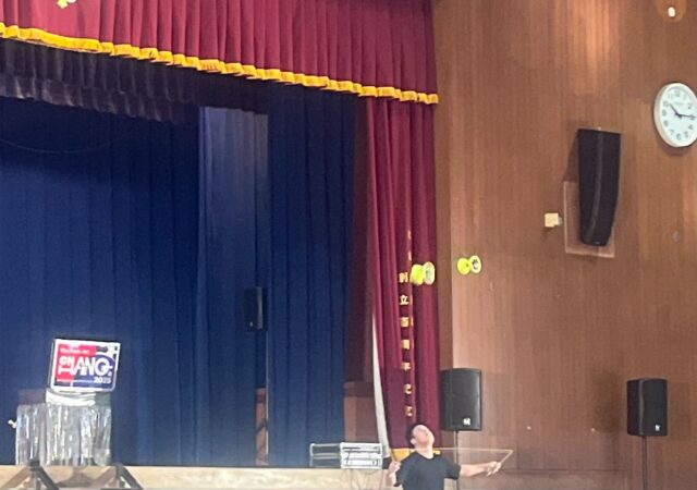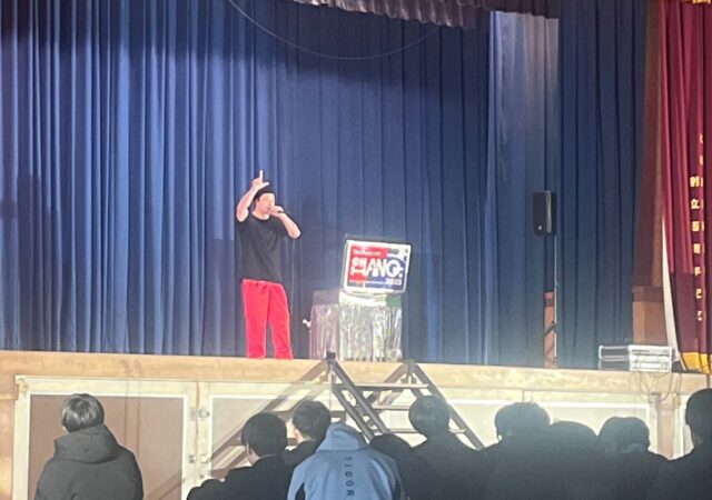 ジャグリングによるパフォーマンス、講演、そしてラップという多彩な内容に、生徒も興味津々でした。講演では、ご自身のこれまでの人生を振り返りながら、在日コリアンの歴史や背景について、丁寧に、わかりやすく語ってくださいました。普段なかなか触れることのない視点からのお話は、大変学びの多いものでした。また、迫力あるジャグリングのパフォーマンスは会場を魅了し、ラップではご自身の思いが込められた熱いメッセージが力強く伝わってきました。