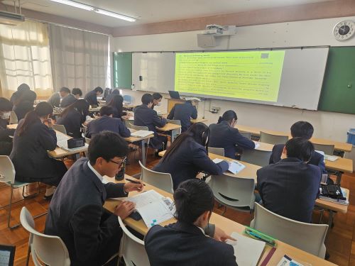 1年「英語コミュニケーション1」におけるReadingの授業を見学しました。この授業は、1年の担任でもあるMarshall先生が担当されています。授業はペアワークを挟みながら、テンポよく「all english」で進められていきます。生徒たちはマーシャル先生の言葉を聞き逃さないよう、ほど良い緊張感とともに時間を過ごしました。中学生の皆さん、鳳高校で英語体験はいかがですか?