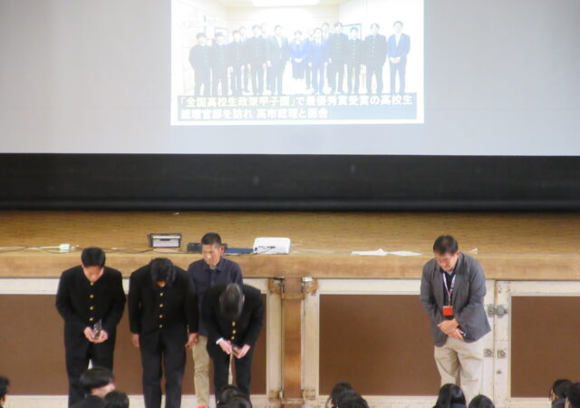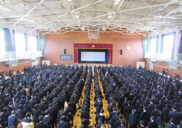 1月8日(木)4時間目、体育館にて全校集会をおこないました。校長講話の後、生徒指導部長からの熱い話、年末に「政策甲子園」最優秀校として首相官邸において高市首相に表敬訪問をおこなった生徒へのクリスタル盾授与、部活の大会において優秀な成績をおさめた生徒への表彰、そして、今回新設?された一歩先ゆく取組みを讃えた「Extra Miler Award」の紹介があり、初代受賞の栄誉に輝いたのは女子バスケ部でした。体育館が穏やかな空気でつつまれました。ありがとう。