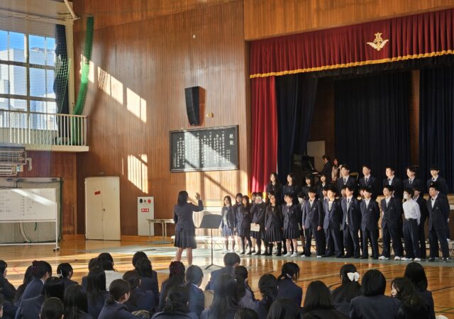 1月22日(木)午後、体育館において80期生の合唱コンクールをおこないました。短期間の準備の中、各クラスによる課題曲「校歌」自由曲「クラス毎」が披露されました。忘れないで欲しいことは(1)クラスの仲間と歌っていた時のあなたの気持ち(2)耳に残っているクラスの仲間たちの歌声 です。みなさんの懸命な歌唱、すばらしかったです。優しく見守る先生方もステキでした。