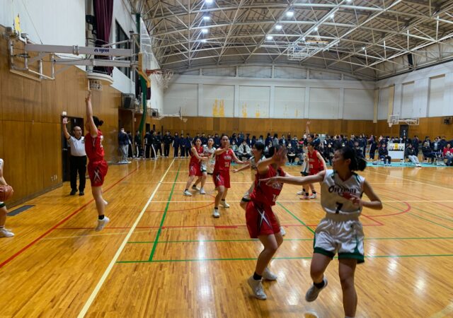 初戦の香里丘高校は、インサイドとアウトサイドのプレーをうまく使い分け、一度リズムに乗るとなかなかペースが乱れない強豪です。やはり気持ちが弱いのか、激しいプレッシャーの前では消極的なプレーが目立ち、パスを探してしまいます。強気にチャレンジしてやっと互角に持ち込めるかどうかの勝負なのに、最初から逃げの選択をしては勝てないでしょう?と鼓舞し、泥臭いバスケットで勝利を目指します。後半は、ルーズボールとリバウンドの飛びつきでセカンドチャンスをものにし、みるみるうちに点差を縮めることに成功!終わってみれば、42-35でまさかの逆転勝利となりました。過去1度も勝利したことのないチームだったので、この大金星は嬉しいですね。よく頑張りました。反省点も多いゲームでしたが、次につながるゲームになったかと思います。